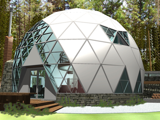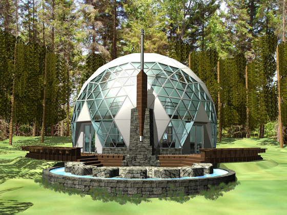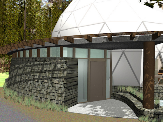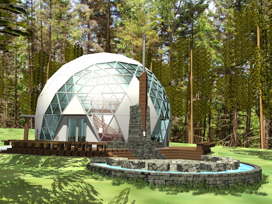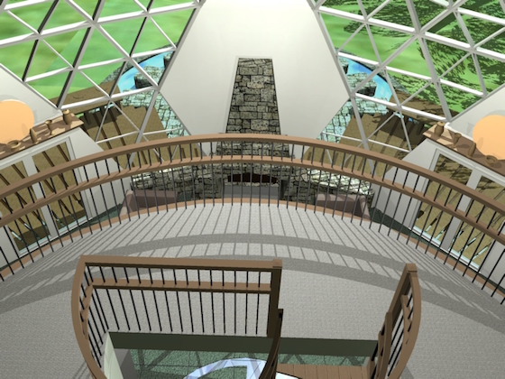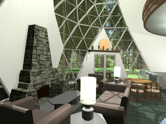 A Bucky Fuller style geodesic dome as a retirement home in Vermont?! The geometry proved fascinating. We highlighted the direct simplicity of the sphere by choosing a 5/8 dome to avoid an igloo effect. All windows and doors were recessed to maintain the gentle, rounded outline. A stone fireplace and sweeping radial porch entry anchor the form. Rainwater is gathered in a reflecting pool surrounding a fire pit. With intrinsic beauty, both materials and views unite the inside and outside worlds, each complementing the other.