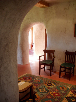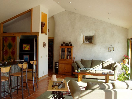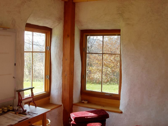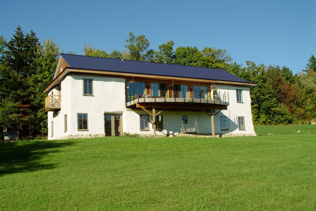 The owners had a strong vision and desire for a solar home, completely off the grid, that would feel connected with the outside and be integrated with the earth. The design uses a simple post frame structure of heavy timbers that uses the straw bale wall as a continuous, uninterrupted blanket wrapping around it. This provided an increased insulation value and the ability to be shaped more freely to the organic aesthetic desired by the owners.