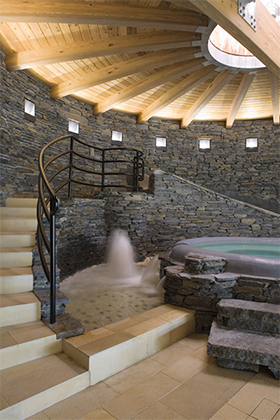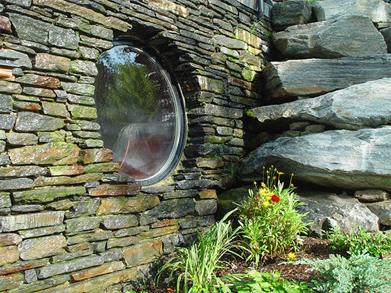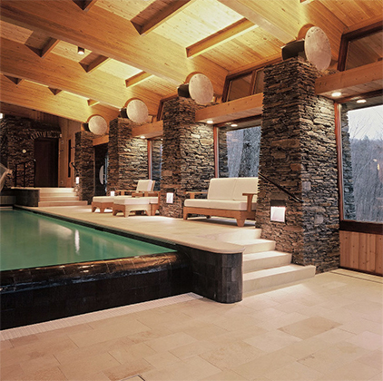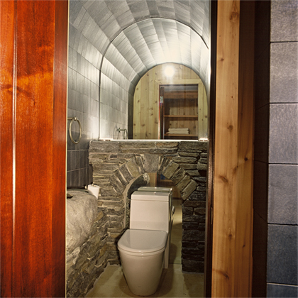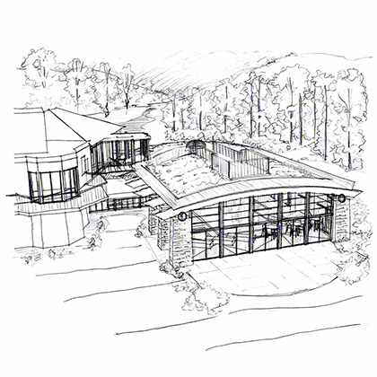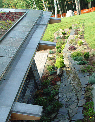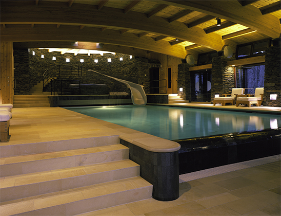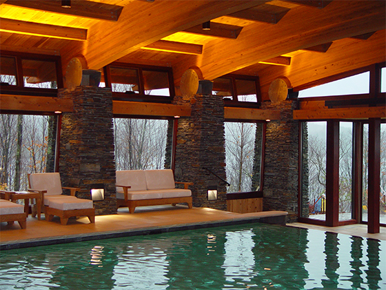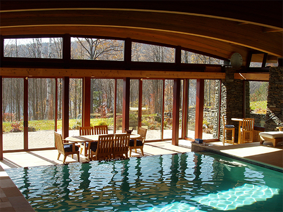 The size of the additional program had the potential to overwhelm the size of the existing house. The solution was to create a pool in a subterranean environment tucked into the site and covered over with a living roof. The entire structure was angled from the house to present a garden roof to be viewed from the breakfast corner of the house. The added program included adequate space for the owners to host large gatherings of families and friends. Elements included a changing room with a dress and stall shower, and a generous bar area. A 40 foot long pool with a weir (infinity) edge, slide, spa and waterfall, as well as a shallow water play area with a water fountain for infants within sight of parents.