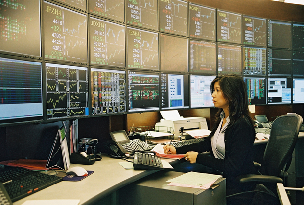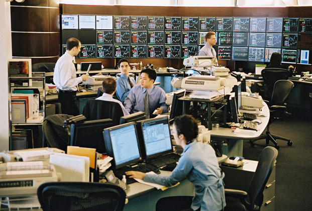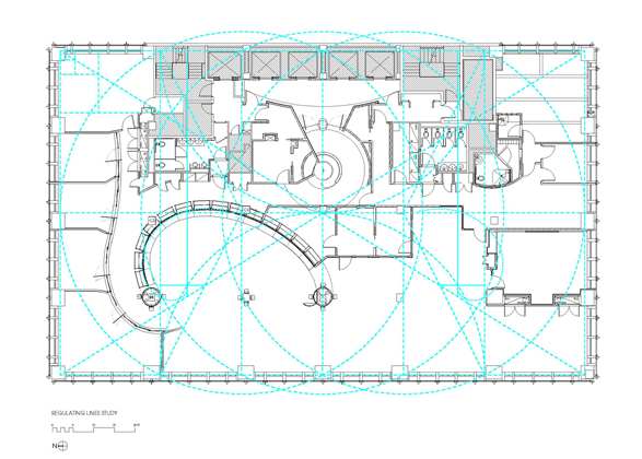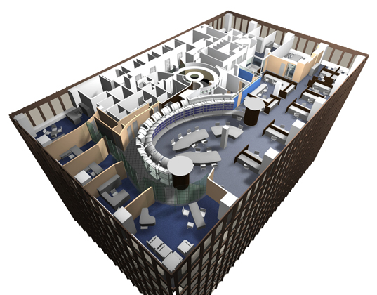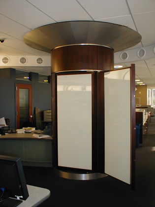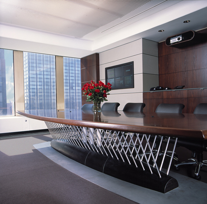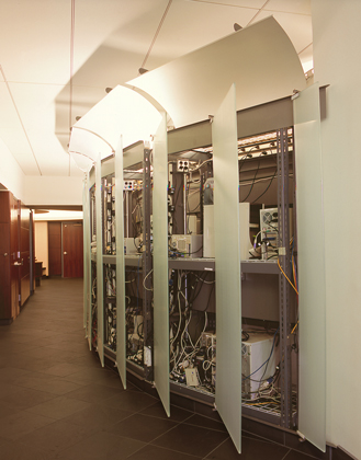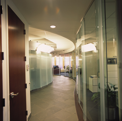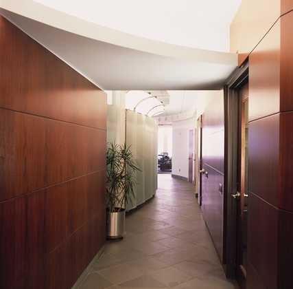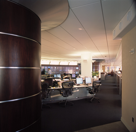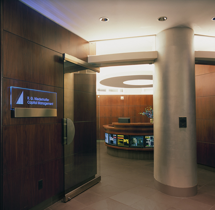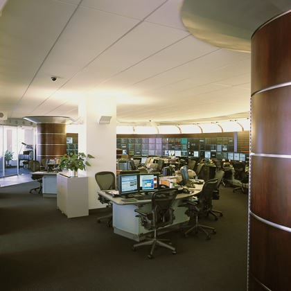 The spacial design of this office features a sweeping transparent wall made of faceted glass panels. Principles of harmonic proportions in scale and volume generate an orchestrated flow within the circuitous path and permit light at every juncture to draw the visitor forward. The trading floor is a semi-elliptical pod, termed ‘The Cranium,’ both for its physical location within the space and for its role as the command center for the operations of the office. The Cranium, theatre-like with its concave wall of monitors, is supported by freestanding racks and surrounds a number of island workstations, which face an unobstructed view of the Hudson River.